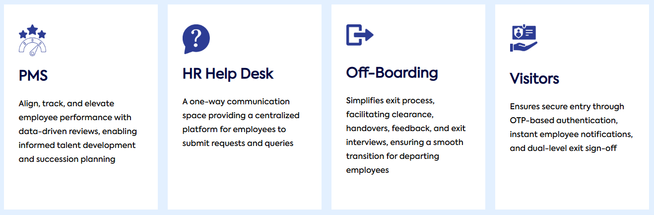 • Module 8 Off-Boarding: Simplifies exit process, facilitating clearance, handovers, feedback, and exit interviews, ensuring a smooth transition for departing employees